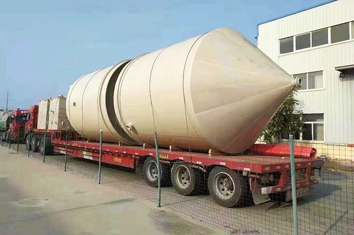 錐底儲罐采用意大利技術製作,內襯層為噴射成型製作,內襯層的富樹脂層樹脂含量達95%,內襯層樹脂含量為80%。儲罐內襯層采用錐形水泥模具製作,儲罐結構層為整體纏繞製作而成。罐體底部為帶鋼套環支腿,大大提升儲罐穩定性。攪拌型錐底立式儲罐,內設擋流板,罐體頂部設置支撐架,儲罐輕質、高強,耐腐蝕性強、使用壽命長。